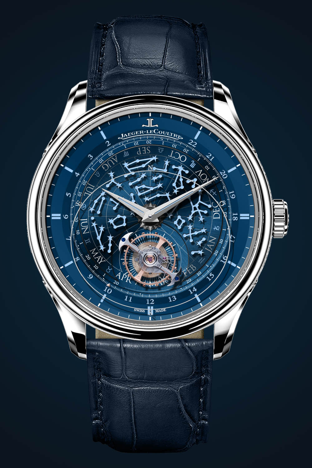 Tourbillon Celeste не являются новыми часами JLC, но они преображались, чтобы обрести новую форму. Корпус диаметром 43 мм, выполненный из 18-каратного белого золота, сочетается с текстурами, освещением и поверхностями. Зеркально отполированный на большинстве частей, он подчеркивается прямолинейными акцентами на полосе корпуса, вогнутых и выпуклых областях и матовых или блестящих поверхностях. Часы представлены на синем ремешке из кожи аллигатора.