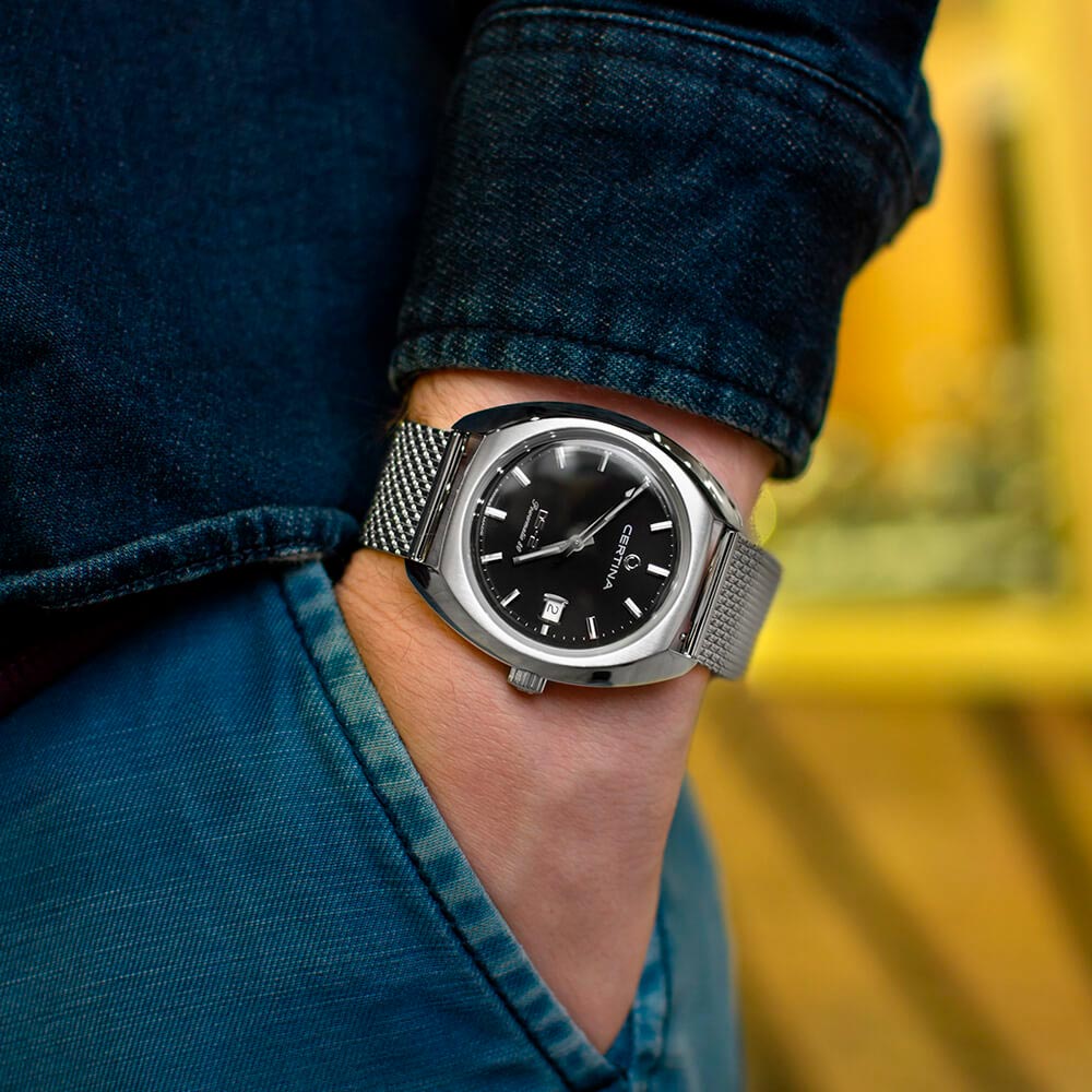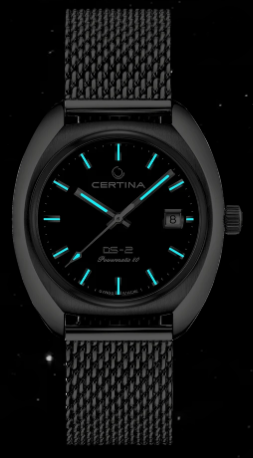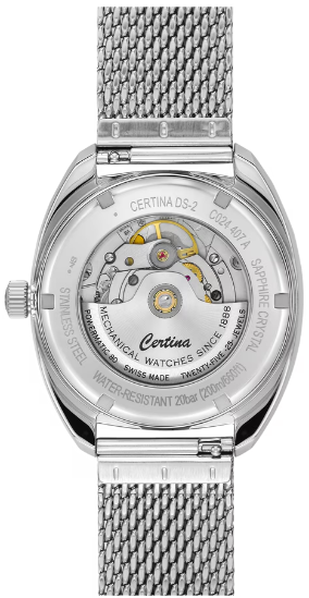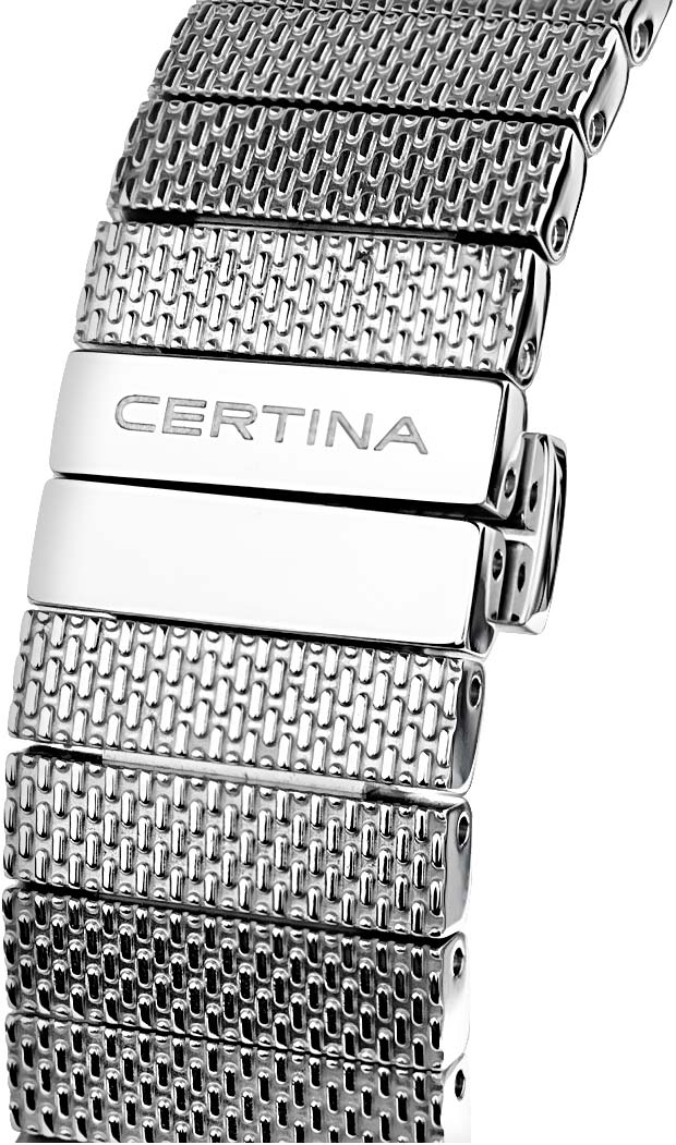 Эта история включает множество имен и дат, определивших ее ход. Летопись швейцарской часовой марки Certina отмечает 1968-й год следующей значительной вехой: в этом году модель DS-2 задала новые стандарты надежности в часовом искусстве. Сегодня эффектный стиль 60-х переживает второе рождение в современном автоматическом калибре с пружиной NivachronTM, обладающей антимагнитными свойствами. Вес нетто: 140 гр. Для корпуса, браслетов и застежек своих часов марка Certina использует нержавеющую сталь 316L, отличающуюся повышенной износостойкостью, устойчивостью к коррозии и гигиеничностью. В стали содержится совсем небольшое количество никеля, поэтому этот материал не вызывает аллергии при носке. Стекло: одностороннее антибликовое покрытие на сапфировом стекле. Сапфировое стекло состоит из порошка оксида алюминия (Al2O3), раскаленного до 2.000 C. Получаемые в результате сапфировые пласты нарезаются на тонкие пластины, им придают требуемую форму и полируют. Сапфир абсолютно прозрачен, обладает высокой устойчивостью к царапинам и механическим повреждениям. По этим причинам сапфировое стекло стало неотъемлемой деталью концепции DS и используется во всех моделях Certina для защиты циферблата. Водонепроницаемость 20 бар (200 м). Длина корпуса 38 мм, ширина 40 мм, толщина 12.65 мм. Размер браслета у корпуса 20 мм. Покрытие Superluminova на циферблате. Super-LumiNova (SLN) представляет собой cветящийся материал с фосфоресцирующими свойствами. В темноте SLN типа BG W9, который использует Certina, испускает свет в виде голубого мерцания. SLN не вредит здоровью и используется для нанесения на стрелки, индексы и безели. В темноте он через некоторое время теряет свои фосфоресцирующие свойства, но они автоматически восстанавливаются на свету. POWERMATIC 80.611 ETA с запасом хода 80 часов и сплавом Nivachron. (Спирали баланса созданы из инновационного титанового сплава. Этот революционный материал был создан при сотрудничестве с компанией Swatch Group и используется лишь ограниченным числом брендов. Пружины Nivachron обладают повышенной устойчивостью к воздействию электромагнитных полей, ударам, старению материалов, экстремальному перепаду температур, выводят часы на совершенно новый уровень точности и обеспечивают долговечность аксессуара.)