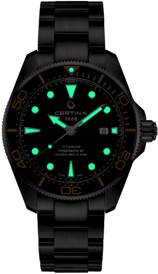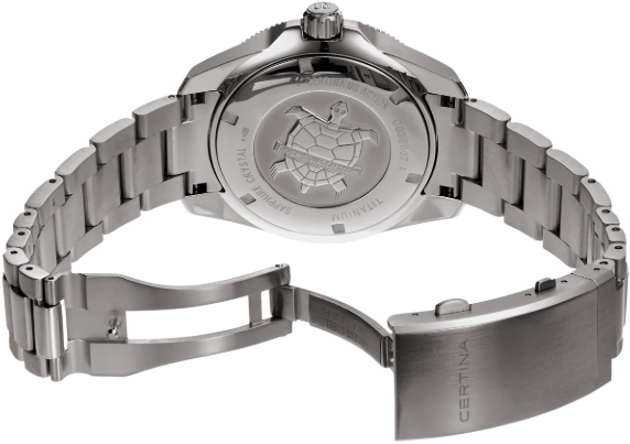 В XXI-м веке к часам предъявляются высокие требования. Дорогие наручные часы должны быть лучшими во всех отношениях – с точки зрения стиля, надежности и точности хода. Новая модель популярной коллекции DS Action Diver швейцарской марки Certina несомненно станет победителем этой гонки. Дайверские часы диаметром 43 мм отличаются классическим вневременным дизайном, водонепроницаемостью до 300 м и современным автоматическим калибром с пружиной, обладающей антимагнитными свойствами. Титан – это особо прочный, гипоаллергенный, устойчивый к коррозии и очень легкий металл (он в два раза легче стали). Он используется для изготовления самых комфортных в носке корпусов, браслетов и застежек марки Certina. Керамика, используемая в часовом искусстве, обжигается при температуре более 900 °C, что обеспечивает ее высокую прочность. Керамические безели, кабюшоны и детали браслетов марки Certina имеют не только красивый внешний вид, но обладают устойчивостью к царапинам, гипоаллергенностью и способностью долгое время сохранять первоначальную яркость и блеск. Super-LumiNova (SLN) представляет собой cветящийся материал с фосфоресцирующими свойствами. В темноте SLN типа BG W9, который использует Certina, испускает свет в виде голубого мерцания. SLN не вредит здоровью и используется для нанесения на стрелки, индексы и безели. В темноте он через некоторое время теряет свои фосфоресцирующие свойства, но они автоматически восстанавливаются на свету. Сапфировое стекло состоит из порошка оксида алюминия (Al2O3), раскаленного до 2.000 C. Получаемые в результате сапфировые пласты нарезаются на тонкие пластины, им придают требуемую форму и полируют. Сапфир абсолютно прозрачен, обладает высокой устойчивостью к царапинам и механическим повреждениям. По этим причинам сапфировое стекло стало неотъемлемой деталью концепции DS и используется во всех моделях Certina для защиты циферблата. Вес нетто 130 гр. Стекло сапфировое с односторонним антибликовым покрытием. Качество сапфирового стекла повышает подавление бликов с одной или с обеих сторон. Часы марки Certina имеют высококачественное двухстороннее антибликовое покрытие, обеспечивающее оптимальную прозрачность стекла. Водонепроницаемость до 300 метров. Часы для дайверов, разработанные в соответствии со стандартом ISO 6425:2018. Диаметр корпуса 43 мм. Толщина 13.1 мм. Между креплениями 21 мм. Механизм швейцарский ETA POWERMATIC 80.611 с запасом хода 80 часов и сплавом Nivachron. Спирали баланса созданы из инновационного титанового сплава. Этот революционный материал был создан при сотрудничестве с компанией Swatch Group и используется лишь ограниченным числом брендов. Пружины Nivachron обладают повышенной устойчивостью к воздействию электромагнитных полей, ударам, старению материалов, экстремальному перепаду температур, выводят часы на совершенно новый уровень точности и обеспечивают долговечность аксессуара. Запас хода показывает количество времени, которое могут идти механические часы без подзавода. Большинство часов имеют запас хода около 38-42 часов. Powermatic 80, инновационный автоматический калибр Certina имеет запас хода до 80 часов – почти в два раза больше, чем у сопоставимых моделей. Удлинение для надевания часов на гидрокостюм.