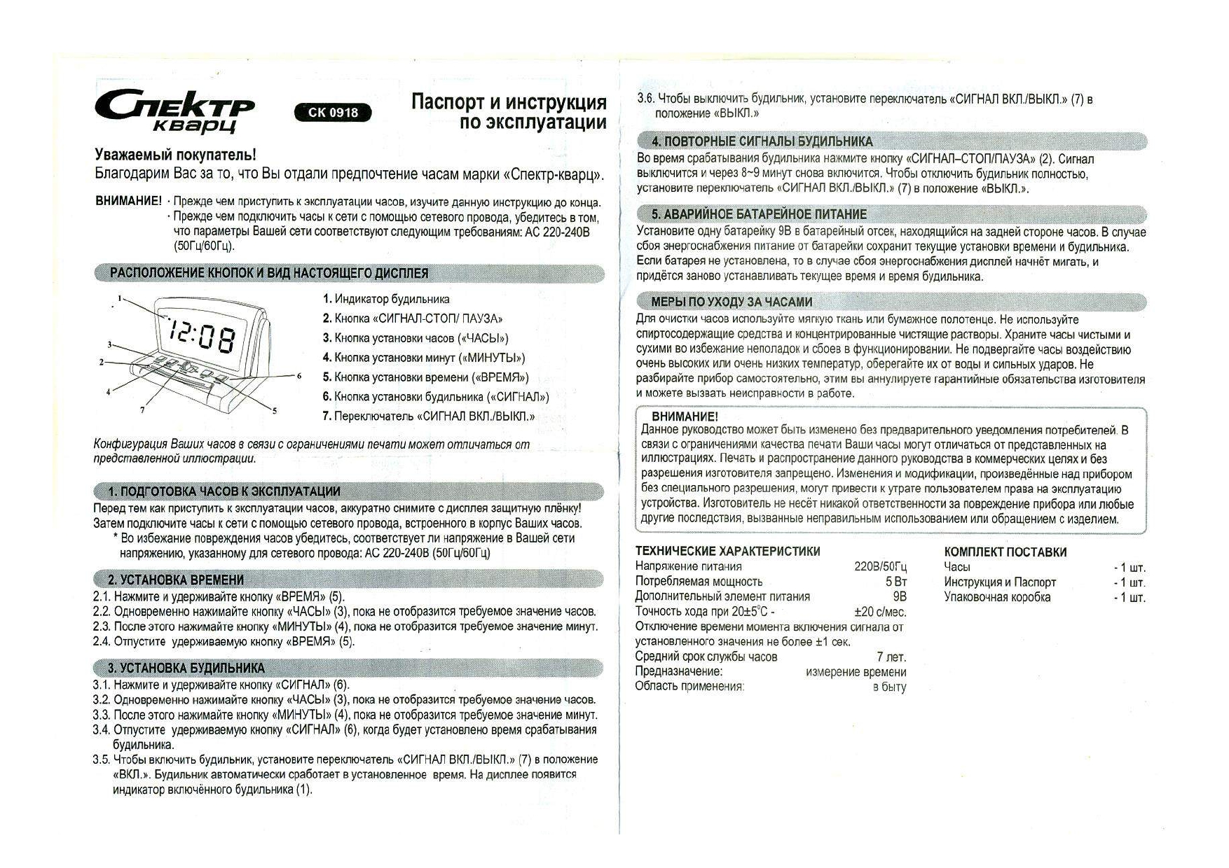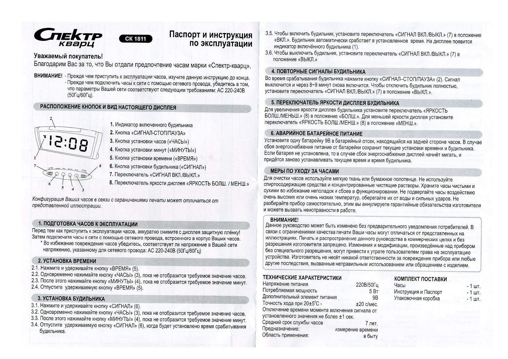 Ниже приведены самые распространенные инструкции к будильникам СПЕКТР: СК 1811, СК0610, СК0090, СК0720, СК0918, СК1215, СК1817, СК1819